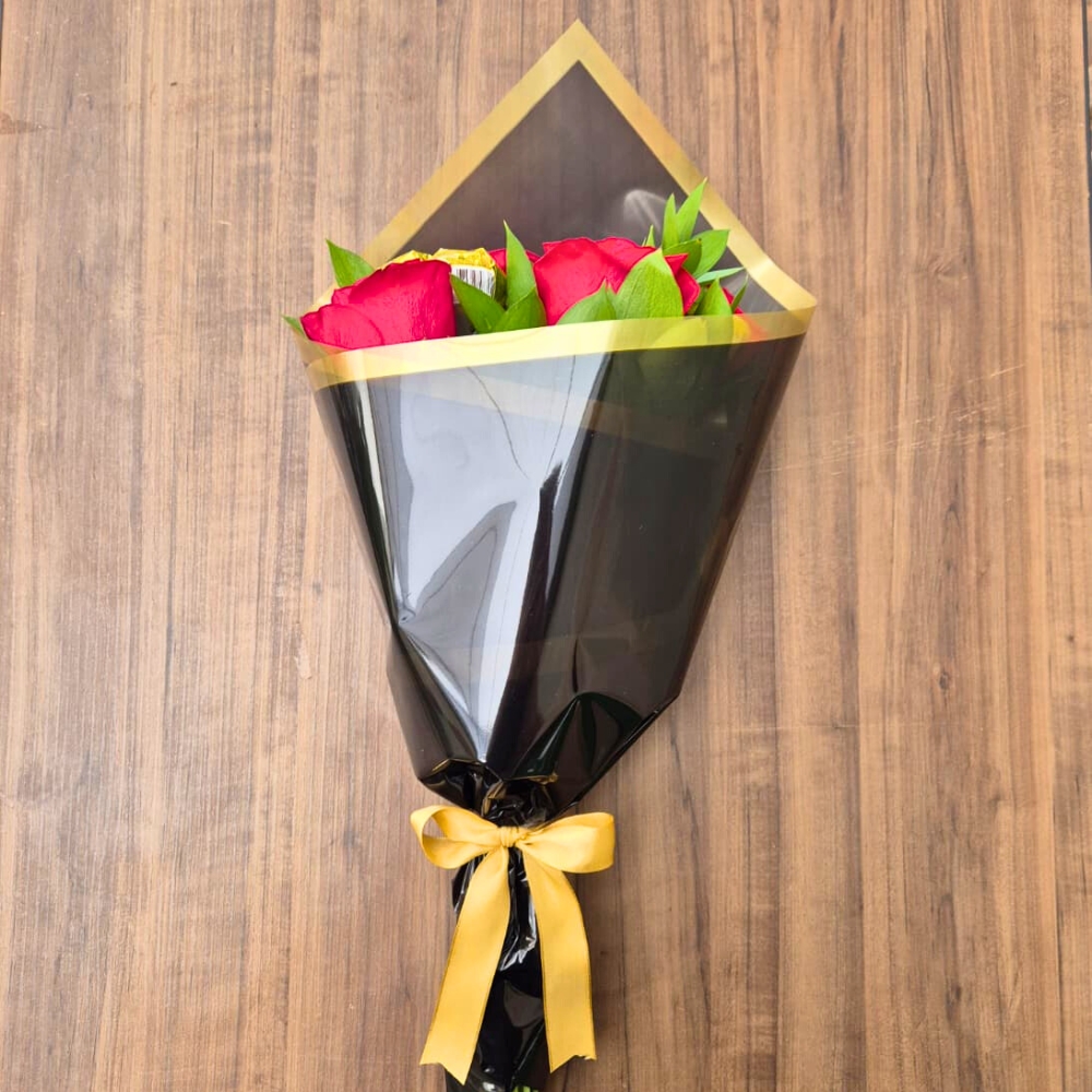 O Buquê com 5 Rosas Vermelhas e Bombons Ouro Branco é ideal para surpreender com afeto, beleza e doçura. Cada bombom vem montado em vareta, compondo o arranjo com charme e originalidade.