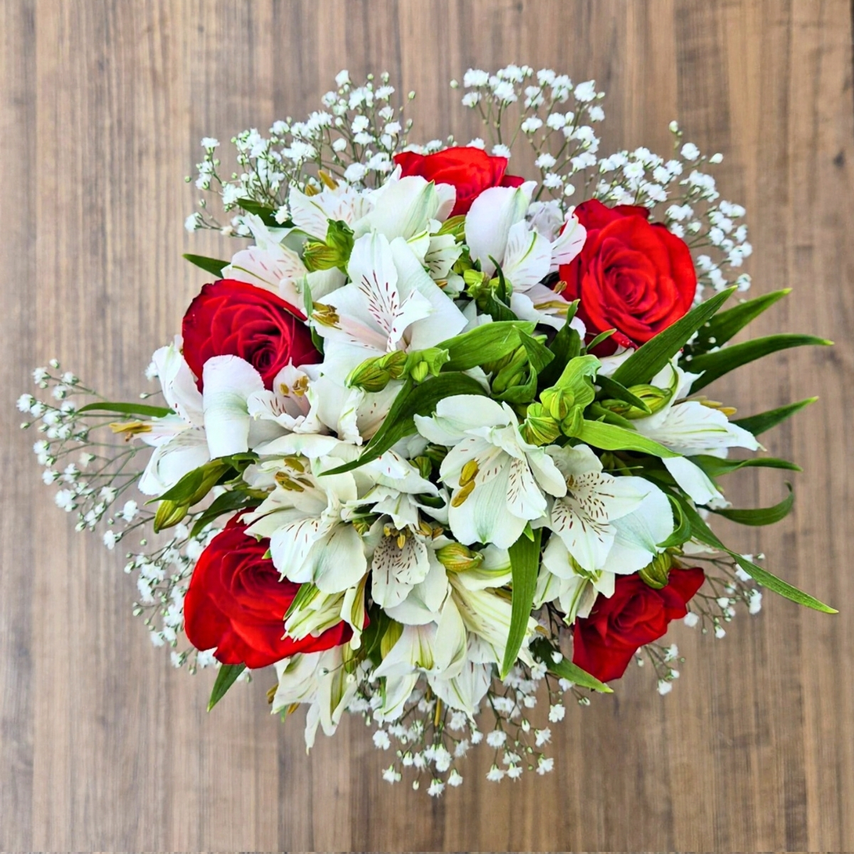 O Buquê de Noiva com Rosas, Alstroemérias e Gypsophila combina o charme das rosas vermelhas com a leveza das alstroemérias e o toque etéreo do mosquitinho — uma escolha atemporal para o grande dia.