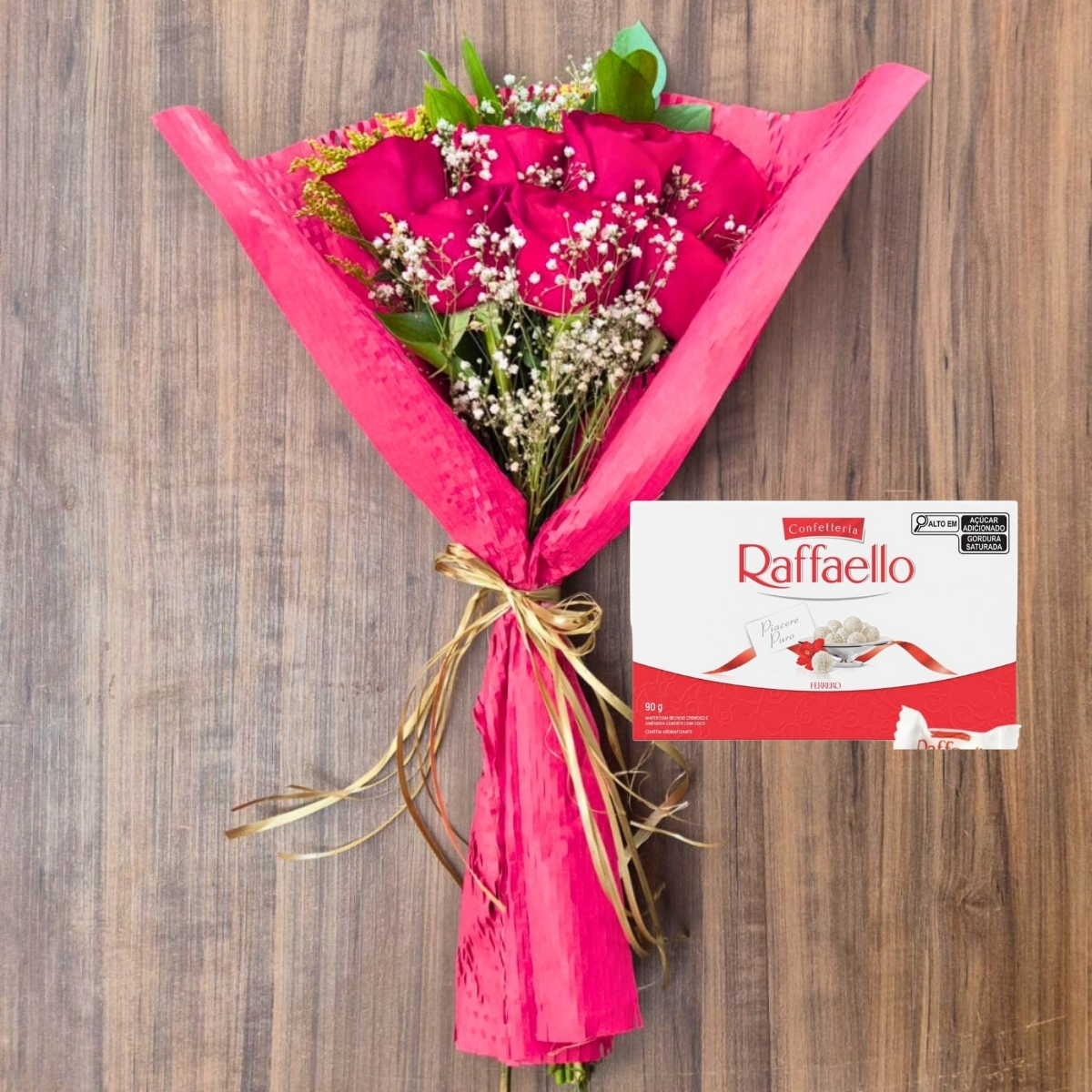 O Buquê Elegância com 7 Rosas Vermelhas, Folhagens e Raffaello une a beleza das flores frescas com o sabor delicado do bombom Raffaello, criando o presente ideal para encantar em qualquer ocasião.