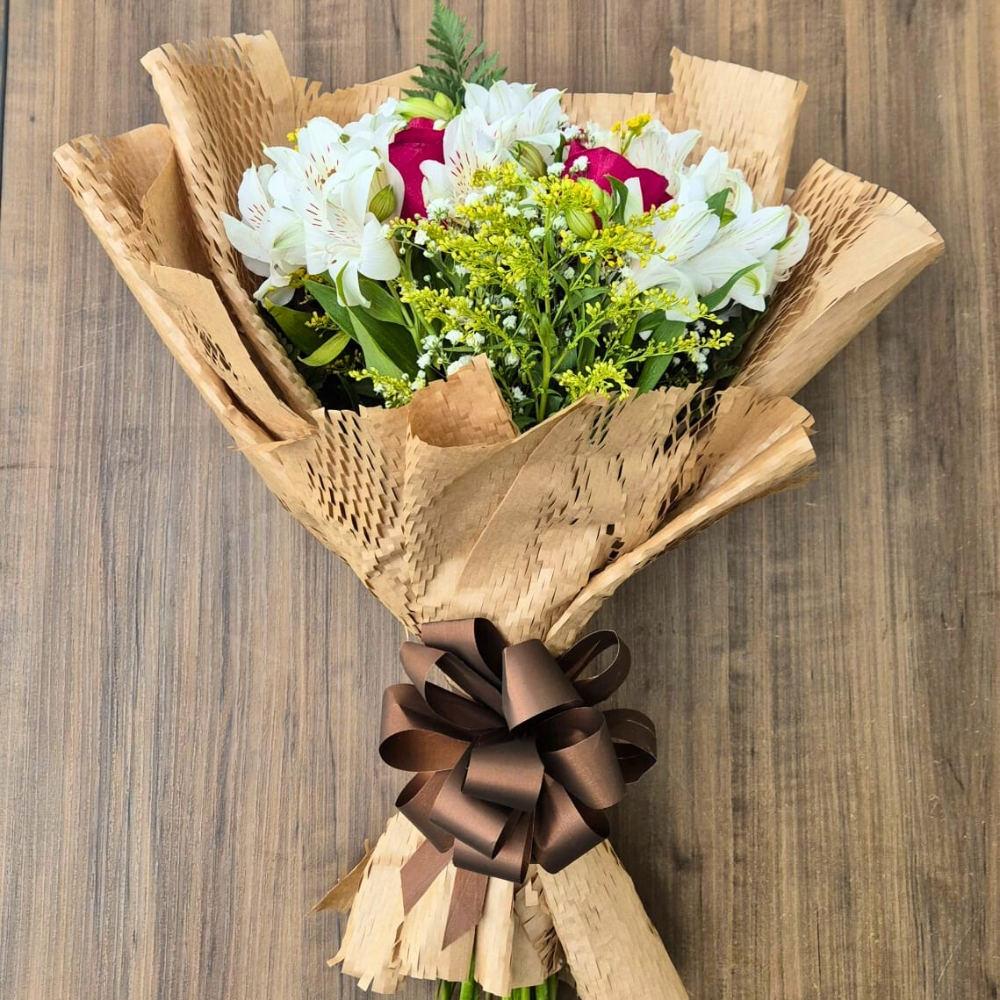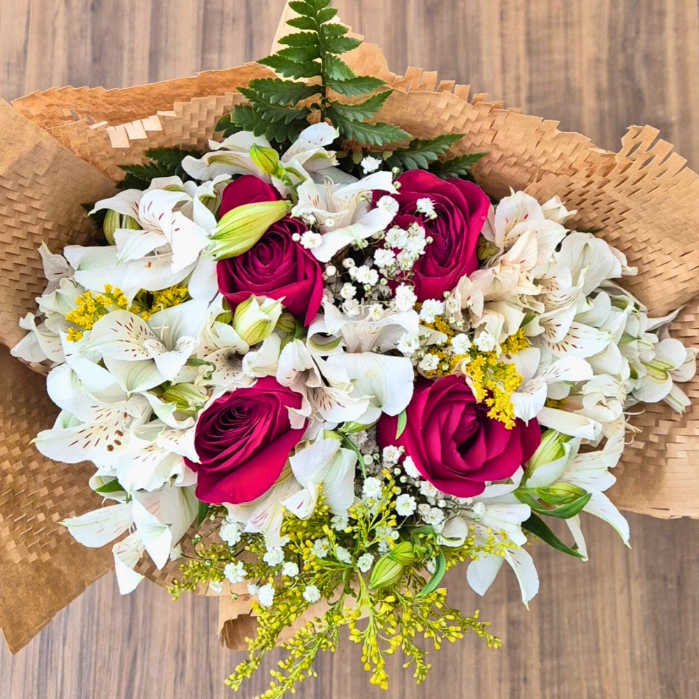 O Buquê Encanto com Rosas, Alstroemérias e Folhagens combina cores vibrantes, texturas delicadas e um acabamento elegante que impressiona à primeira vista.