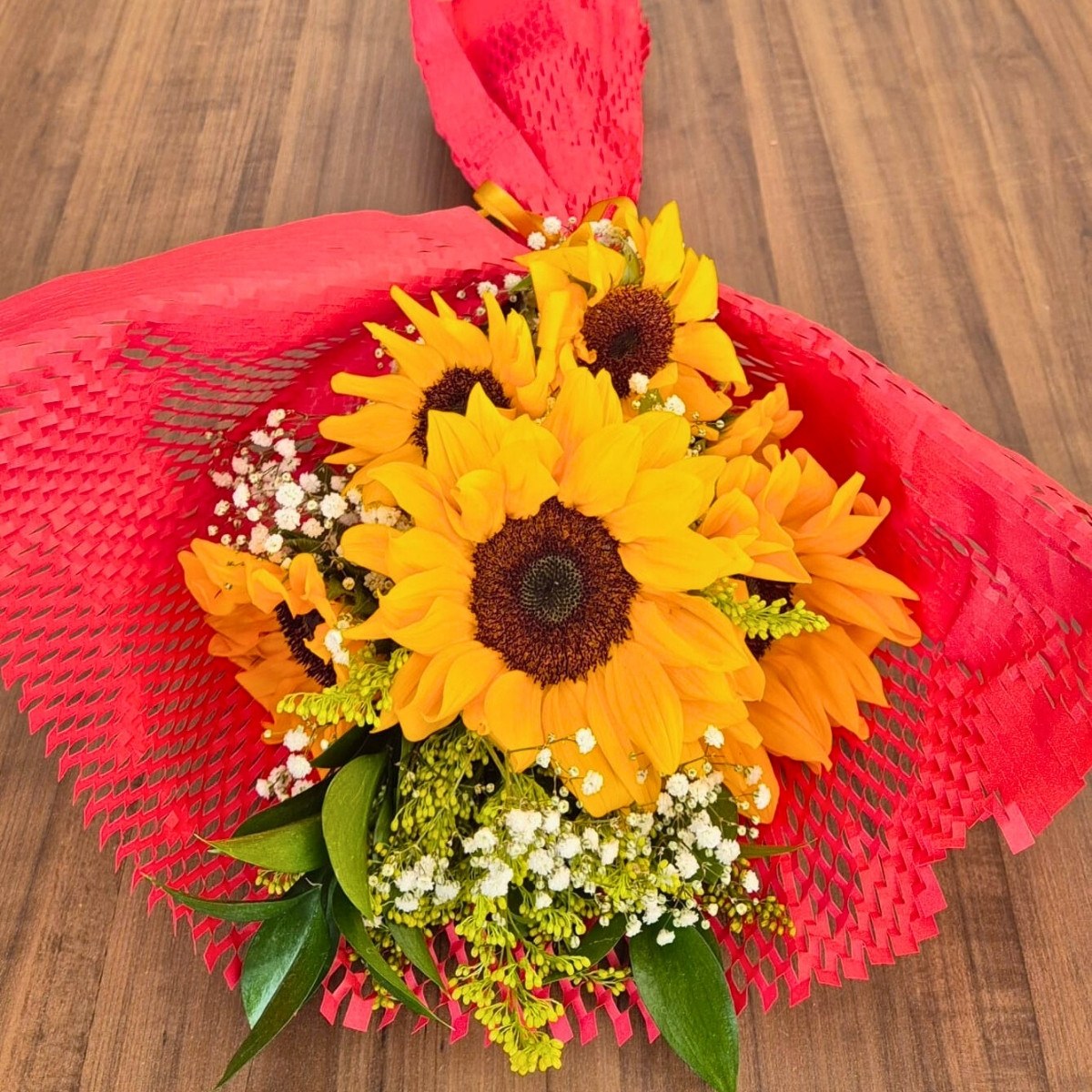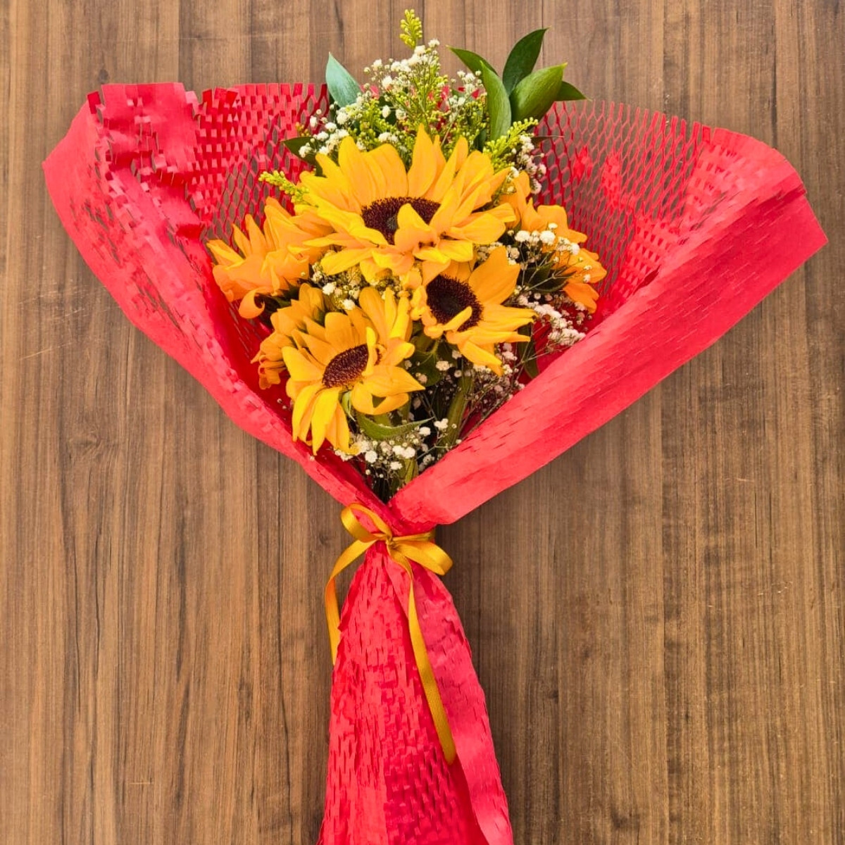 O Buquê com Girassóis e Folhagens Naturais combina a vibração dos girassóis com o toque verde das folhagens e a delicadeza do tango e da gypsophila.