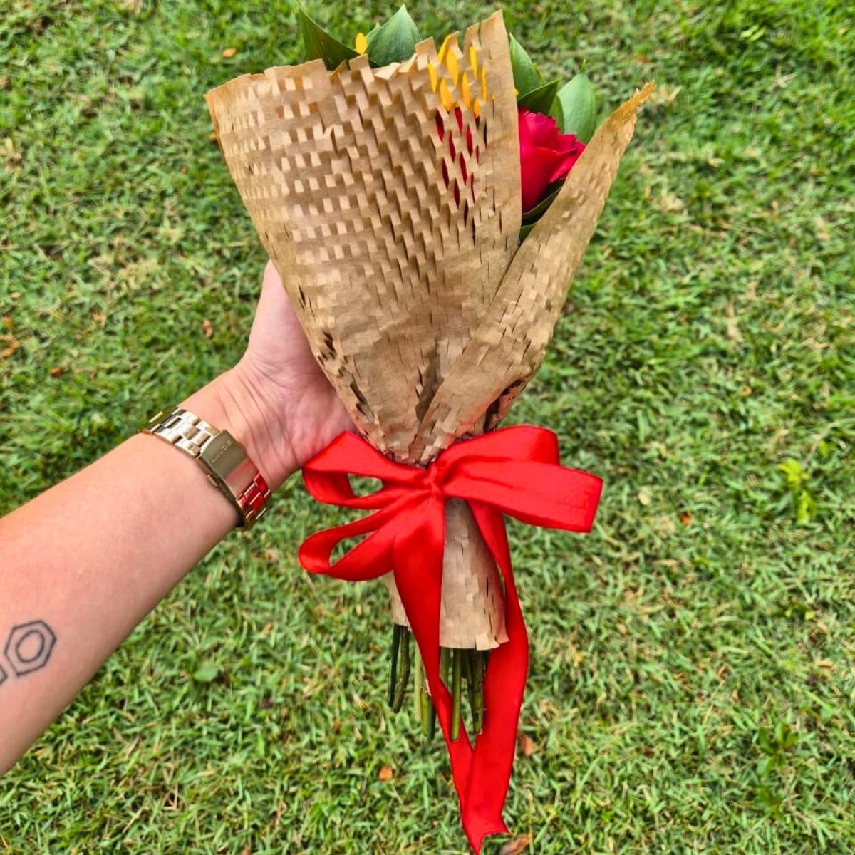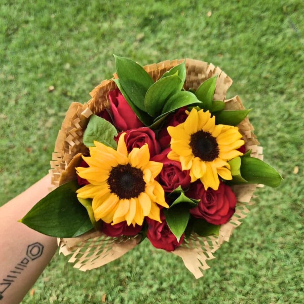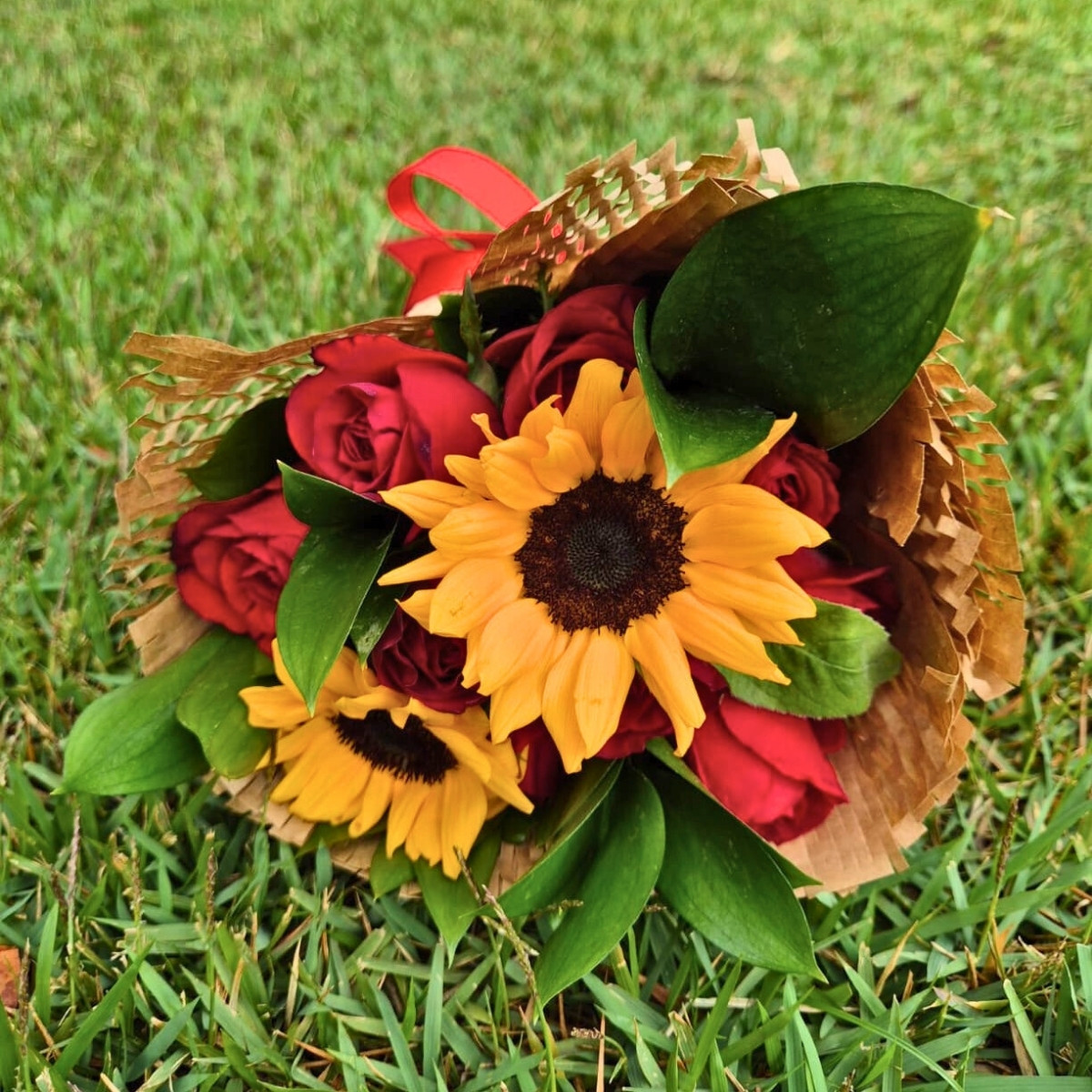 O Buquê com Rosas Vermelhas e Girassóis combina o romantismo das rosas com a energia solar dos girassóis, resultando em uma composição elegante e apaixonante.